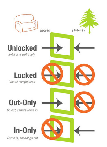 Out-Only: When the pet goes out, he cannot come back in again. A possible use for this setting would be a case where you want the pet out during the day. You'd set the flap on "out only" in the morning.