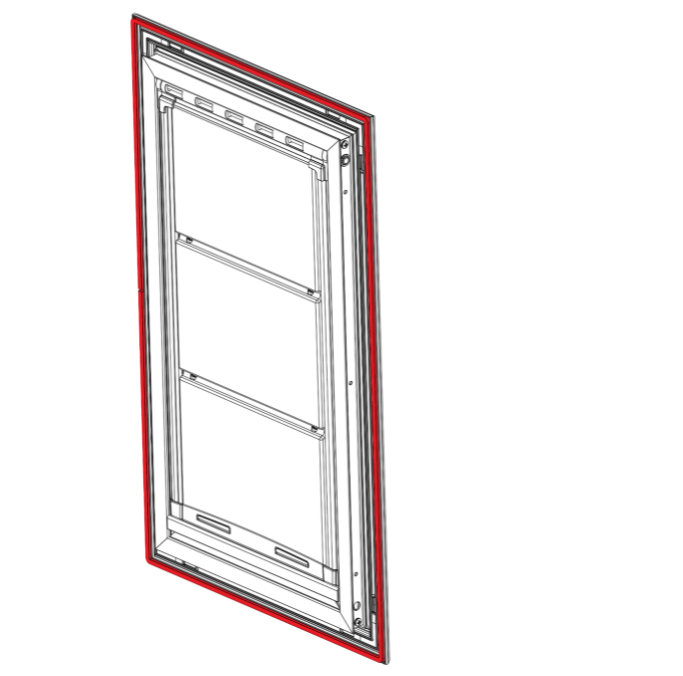 - Ensure the weatherstripping is firmly pressed in the groove on both frames. Weatherstripping indicated in red.
