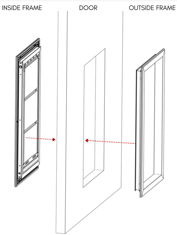 - Place the trim frame on the outside of the door and the flap frame on the inside.