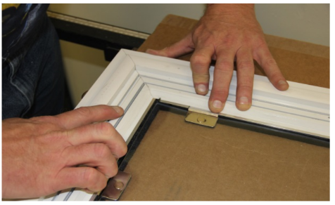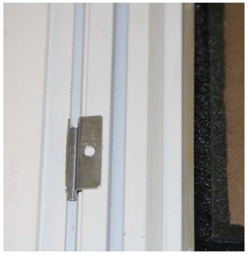 - Place the metal screen retainer clips in the spline track of the people door evenly spaced around the pet door as shown. Depending on the size of the pet door ordered there should be between one and four clips in the bottom track and another one to four clips in the side track of the people door.