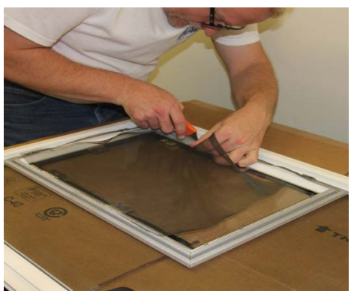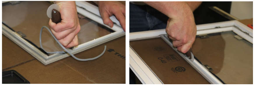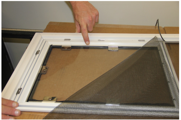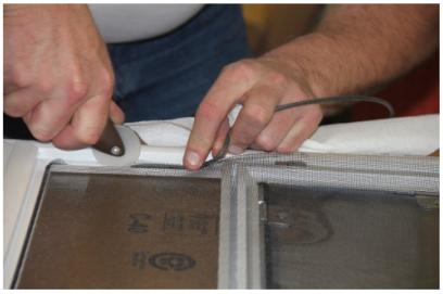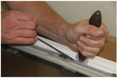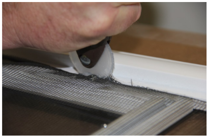 - Insert the screen spline included with your pet door into the spline frame track around all four sides of the pet door being sure to pull the screen fabric taut to make the pet door more secure.