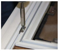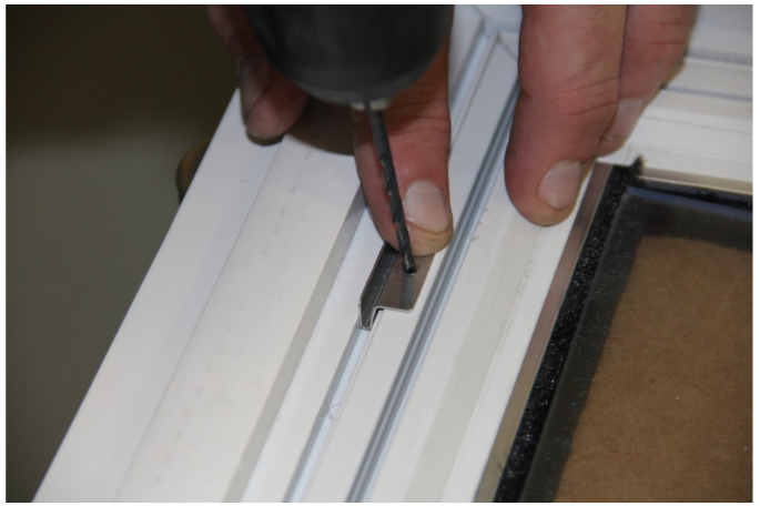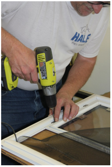 - Holding the pet door snugly against the people door frame, drill through the holes in the metal retainers into the frame of the pet door using the 7/64" drill bit provided.