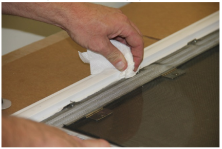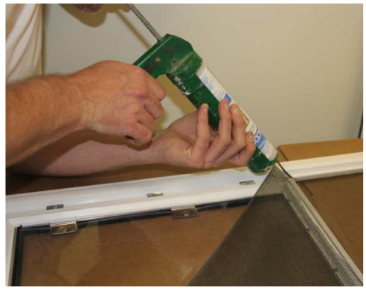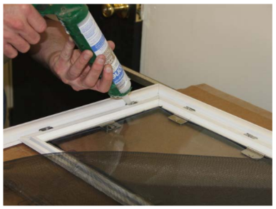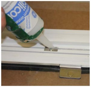 - Run a thin bead of silicone in the spline track on the people door along the side and bottom of the pet door running the silicone over the metal retainers as shown.