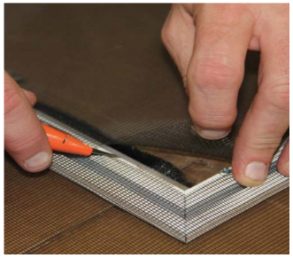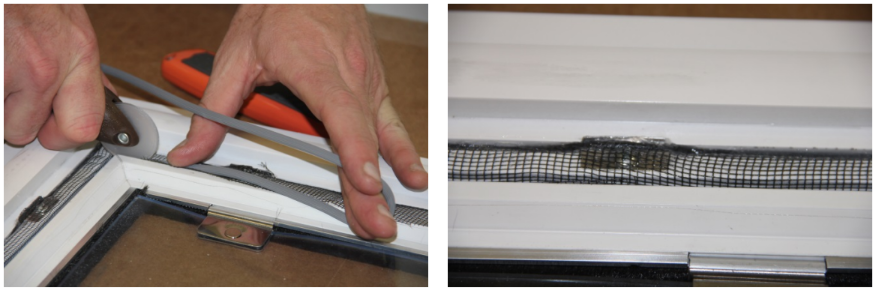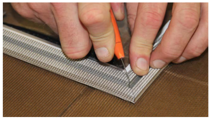 - Cut away any excess screen spline with a razor blade or scissors. Cut away the excess screen material with a razor blade being careful not to cut into the screen spline or the finish of the pet door. If you are installing a stabilizer bar (see next section), leave some excess screen material at this time. You can trim it later after installing the stabilizer bar kit.