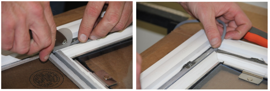 - Lay the screen material back over the pet door. Pull the screen material taut. To hold the screen fabric around the pet door, insert the screen spline that you previously pulled out of the people door with a flat headed screwdriver or screen spline roller.