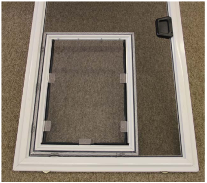 - Using a razor blade, carefully cut the screen fabric inside the perimeter of the pet door near the weather stripping. Be sure to leave enough screen fabric to be pulled down into the track by the screen spline that came with your pet door. You can trim off any excess fabric after the installation is complete. Remove the square of screen fabric and discard.