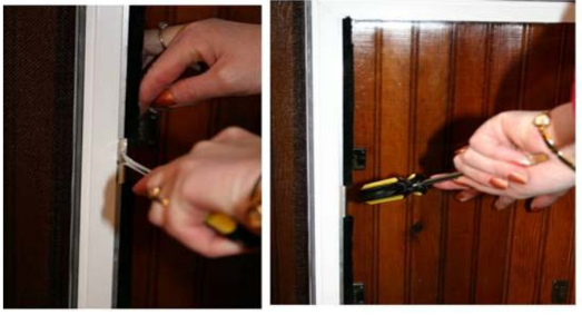 - Remove the screen spline (the ribbed rubber around the screen) from the installation corner. Needle-nosed pliers work very well for removing the screen spline or you can also carefully use a flat head screwdriver or a putty knife at the corner to get started. If using a screwdriver or putty knife, be careful not to cut into the spline or slice into the finish of the door frame.