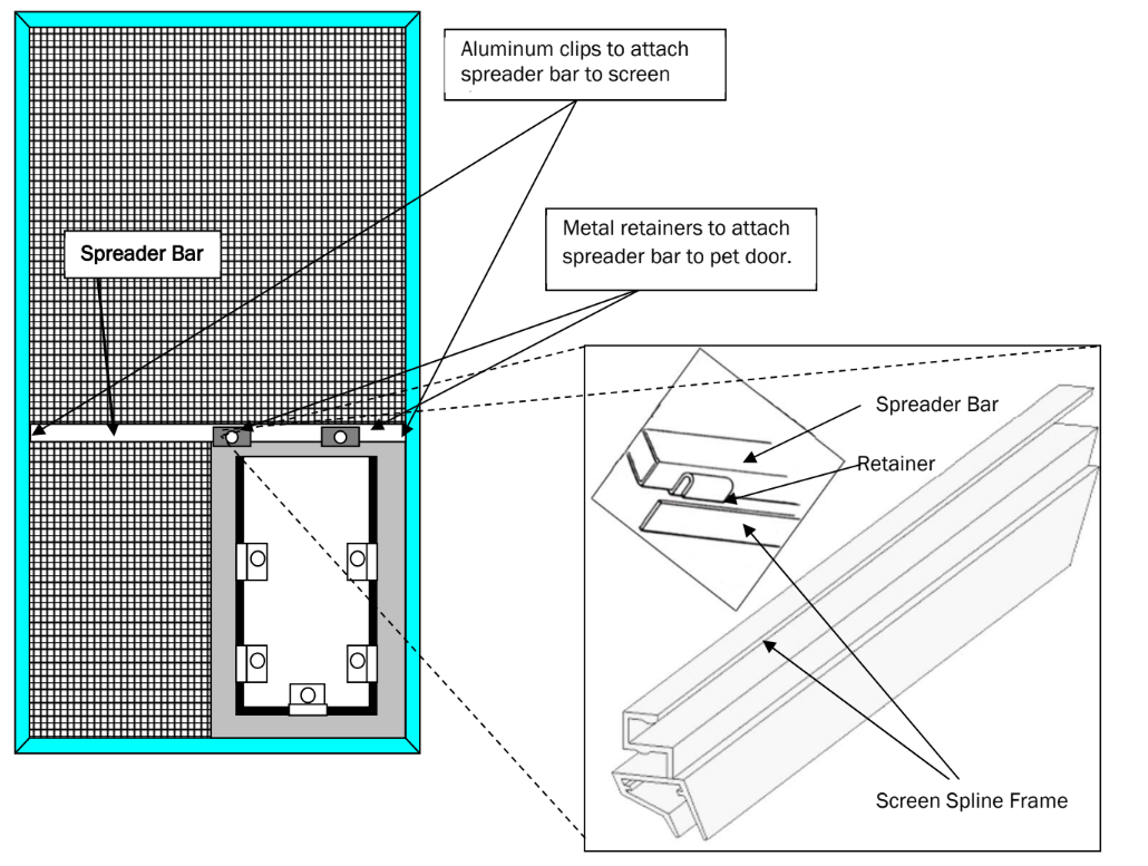The spreader bar is designed to be installed as a brace across the screen door directly above the pet door to add rigidity and strength both to the screen door itself and to the unsupported edge of the pet door. This can be especially important for very large or very active dogs.