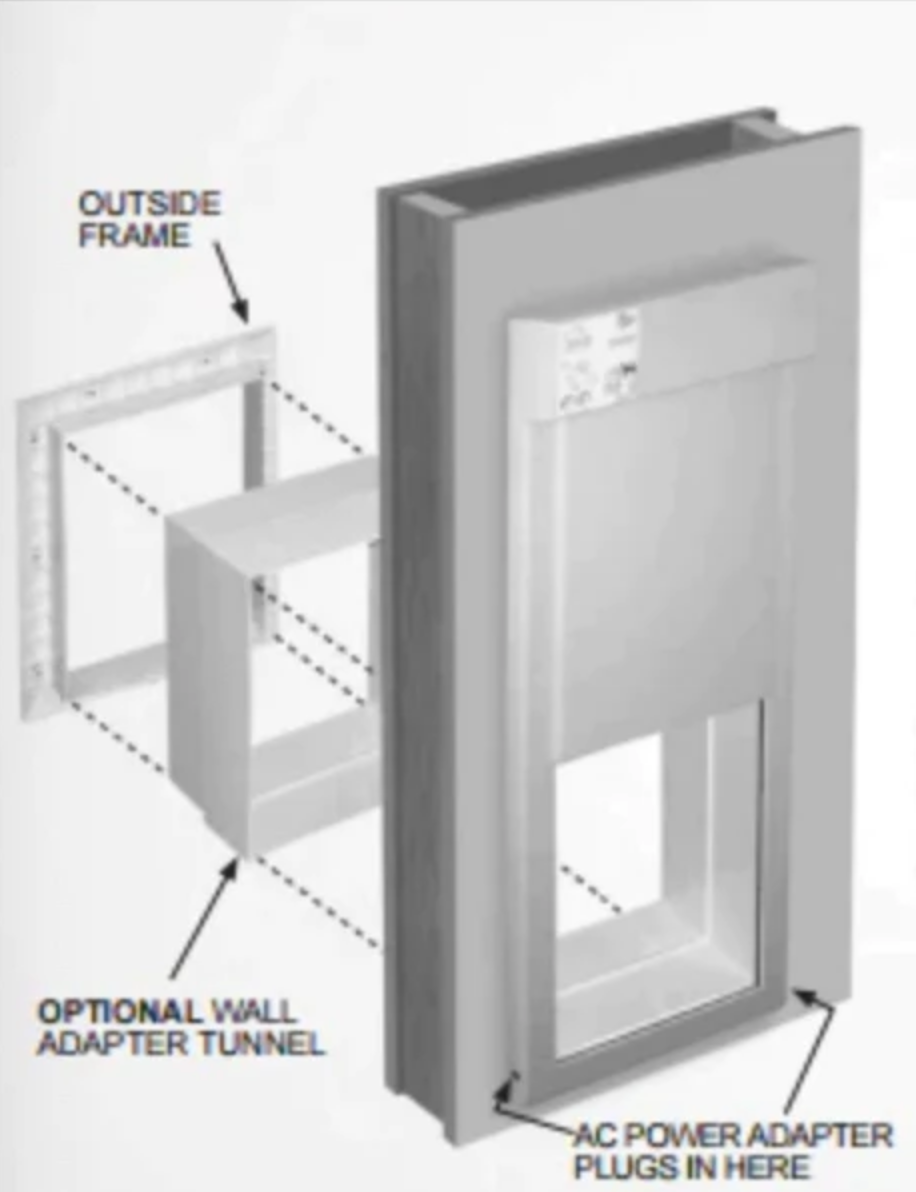 - Outlet: comes with a UL-approved AC adapter that has a 5 feet long cord. Plug the adapter into a nearby wall outlet for continuous operation. The pet door accepts the plug-in on either side.