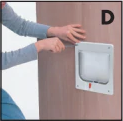 - Place the outer frame that does not contain the flap (D) into the opening from outside the door. Hold it in place and install the screws. Do not overtighten.
