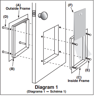 - Caulking is recommended under the outer frame. Place the inner frame (C) (with flap) into the opening from the inside of the door and hold in place. Insert the binder posts (D) through the exterior frame, then install the screws (E) and tighten until snug.